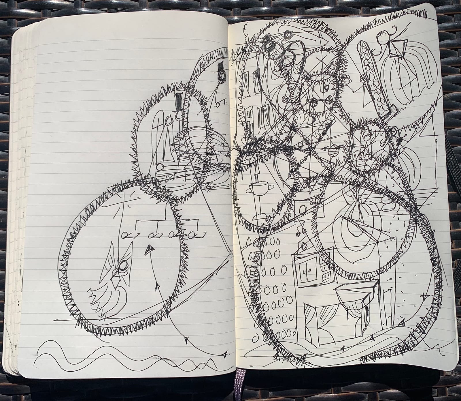I am representing these two sentences, at their station, in images. Like accepting the 12-word title, object and 12 associations, you must accept the first image your subconscious tells you to draw. This is mind-mapping.